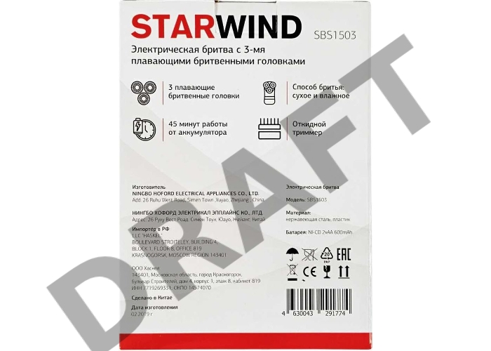 Бритва роторная Starwind SBS1503 реж.эл.:1 питан.:аккум. черный/синий