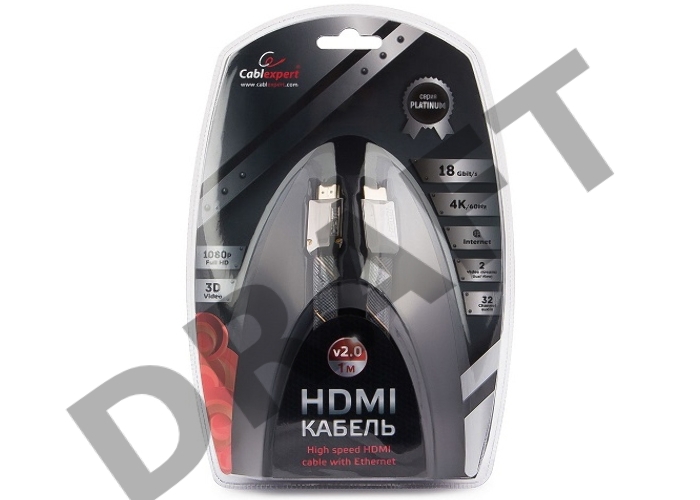 Кабель HDMI Cablexpert, серия Platinum, 1 м, v2.0, M/M, плоский, позол.разъемы, металлический корпус, нейлоновая оплетка, блистер