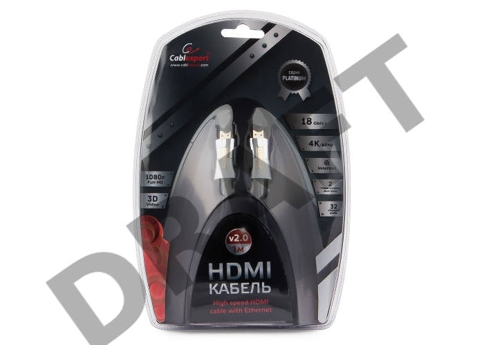 Кабель HDMI Cablexpert, серия Platinum, 1 м, v2.0, M/M, позол.разъемы, металлический корпус, ферритовые кольца, блистер (CC-P-HDMI01-1M)