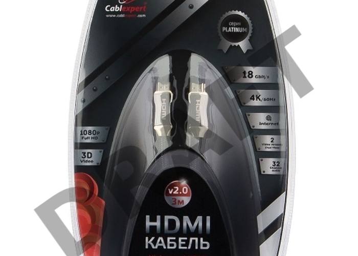 Кабель HDMI Cablexpert, серия Platinum, 3 м, v2.0, M/M, позол.разъемы, металлический корпус, нейлоновая оплетка, блистер