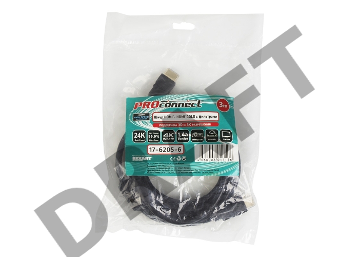 Кабель Proconnect (17-6205-6) Шнур HDMI - HDMI gold 3М с фильтрами (PE bag)