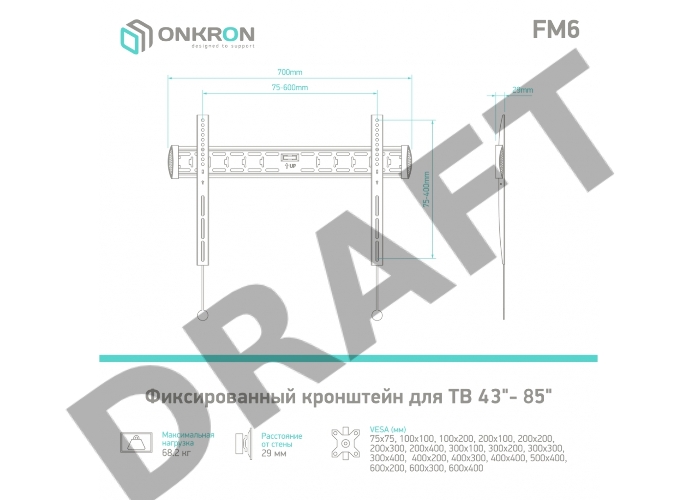 Кронштейн ONKRON FM6 для телевизора 43"-85" фиксированный, чёрный