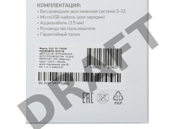 Колонка порт. Digma S-22 черный 15W 1.0 BT 1500mAh (SP2215B)