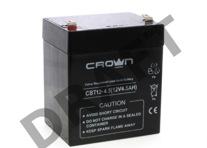 Батарея CROWN CBT-12-4.5, напряжение 12В, ёмкость 4,5 А/Ч, размеры (мм) 90х70х101, вес 1,48 кг, тип клеммы - F2, тип АКБ - свинцово кислотная с загущеным электролитом в гель, срок службы 6 лет