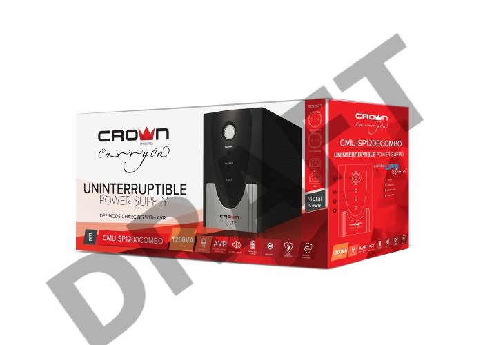 Источник бесперебойного питания CROWN 1200VA/720W, металл, 2x12V/9AH, розетки 2*IEC + 2*EURO, трансформатор AVR 145-280V, съёмный кабель 1.2м, фильтр телефонной и ethernet линии RJ11/45, защита батареи, от перегрузки, от КЗ, ПО