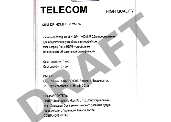 Переходник Telecom Кабель-переходник (TA6055) Mini DisplayPort (M)-> HDMI (F) 6926123462157