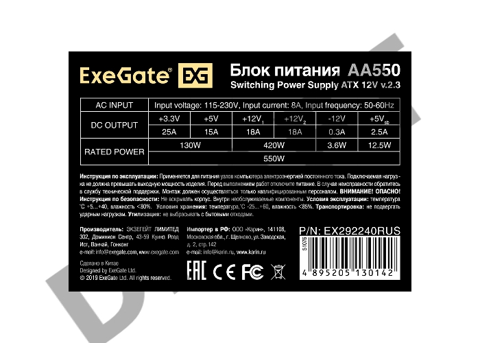 Блок питания 550W ExeGate AA550 (ATX, PC, 8cm fan, 24pin, 4pin, 2xSATA, IDE, кабель 220V в комплекте)