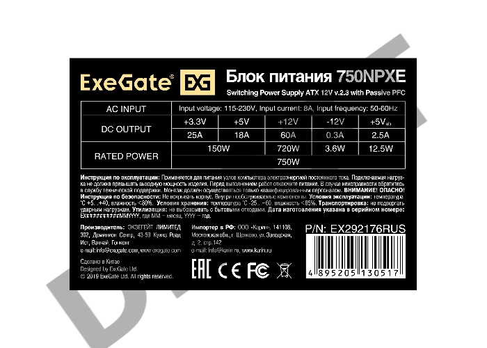 Блок питания 750W ExeGate 750NPXE (ATX, PPFC, SC, 12cm fan, 24pin, 2x(4+4)pin, 2xPCI-E, 5xSATA, 3xIDE,  black, кабель 220V с защитой от выдергивания)