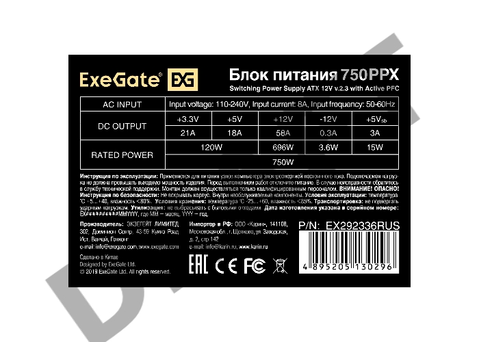 Блок питания 750W ExeGate EX292336RUS 750PPX (ATX, APFC, КПД 80% (80 PLUS), 14cm fan, 20+4pin, 2x2x(4+4)pin, 6xPCI-E, 10xSATA, 4xIDE, Cable Management, black, RTL)