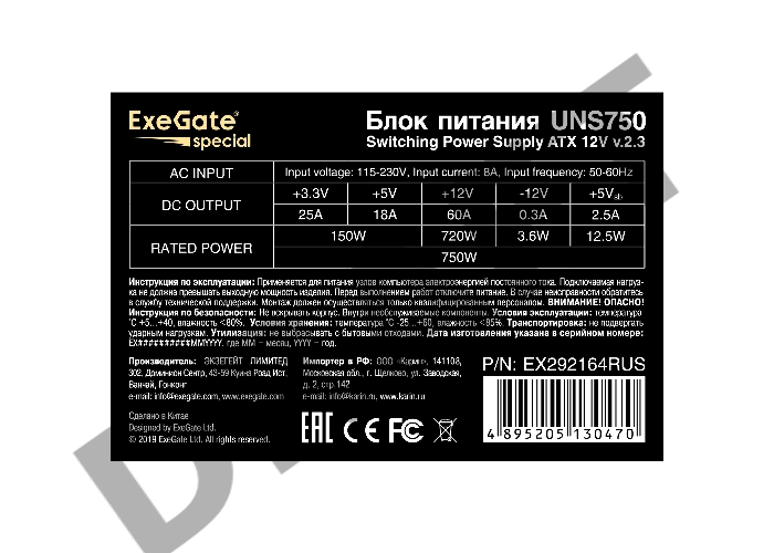Блок питания 750W ExeGate UNS750 (ATX, PC, 12cm fan, 24pin, 4+4pin, PCI-E, 3xSATA, 2xIDE, кабель 220V в комплекте)
