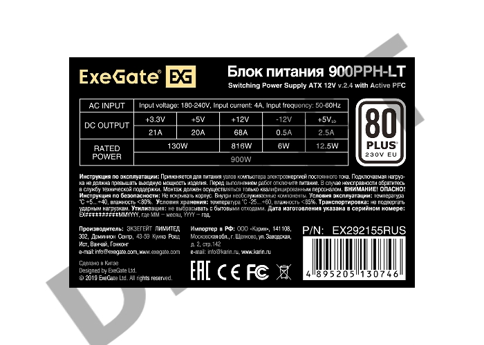 Блок питания 900W ExeGate 80 PLUS® 900PPH-LT-OEM (ATX, APFC, КПД 82% (80 PLUS), 12cm fan, 24pin, 2x(