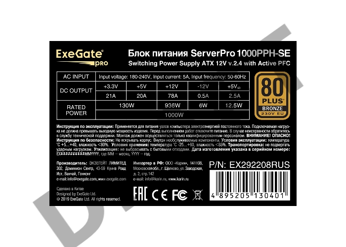 Серверный БП 1000W ExeGate EX292208RUS ServerPRO 80 PLUS® Bronze 1000PPH-SE (ATX, for 3U+ cases, APFC, КПД 89% (80 PLUS Bronze), 12cm fan, 24pin, 2x(4+4)p, 6xPCI-E, 8xSATA, 4xIDE, box, black)