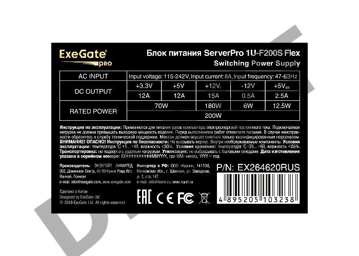 Серверный БП 200W ExeGate EX264620RUS ServerPRO-1U-F200S (Flex ATX, 4cm fan, 24pin, (4+4)pin, 3xSATA, 2xIDE)