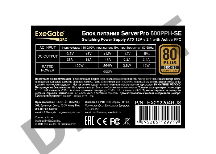 Серверный БП 600W ExeGate ServerPRO 80 PLUS® Bronze 600PPH-SE (ATX, for 3U+ cases, APFC, КПД 89% (80 PLUS Bronze), 12cm fan, 24p, (4+4)p, PCIe, 5SATA, 3IDE, black)