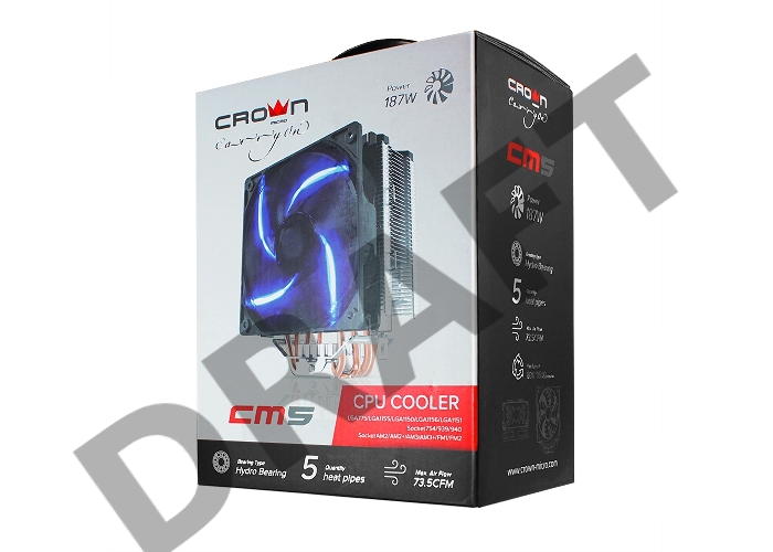 Кулер CROWN CM-5 (Для Intel и AMD,TDP до 187 Ватт,5шт. теплопроводных трубок,Синяя светодиодная подсветка,Гидродинамическии? подшипник,Размер: 148*126*85 мм)