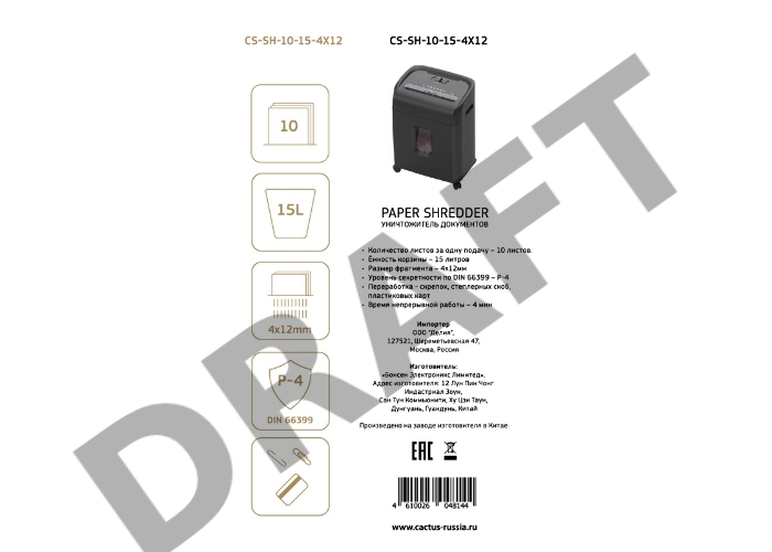Шредер Cactus CS-SH-10-15-4X12 (секр.P-4)/фрагменты/10лист./15лтр./скрепки/скобы/пл.карты