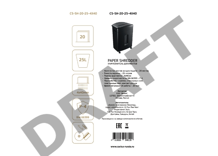 Шредер Cactus CS-SH-20-25-4X40 (секр.P-4)/фрагменты/20лист./25лтр./скрепки/скобы/пл.карты/CD