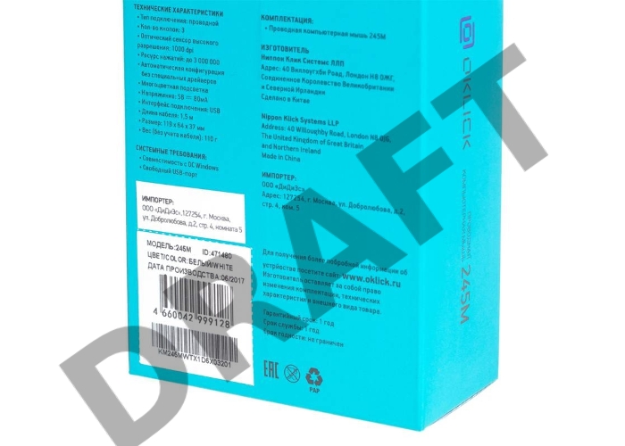 Мышь Oklick 245M белый оптическая (1000dpi) USB (3but)