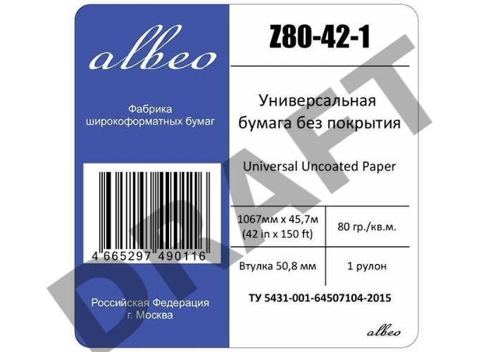 Бумага Albeo InkJet Paper, для плоттеров, универсальная, в рулонах, втулка 50,8 мм, белизна 146%, ширина рулона/длина/плотность (1,067х45,7 м., 80 г/к