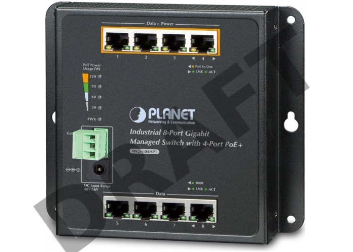 Индустриальный коммутатор Planet IP30, IPv6/IPv4, 8-Port 1000TP Wall-mount Managed Ethernet Switch with 4-Port 802.3AT POE+ (-40 to 75 C), dual redundant power input on 48-56VDC terminal block and power jack, SNMPv3, 802.1Q VLAN, IGMP Snooping, SSL, SSH,