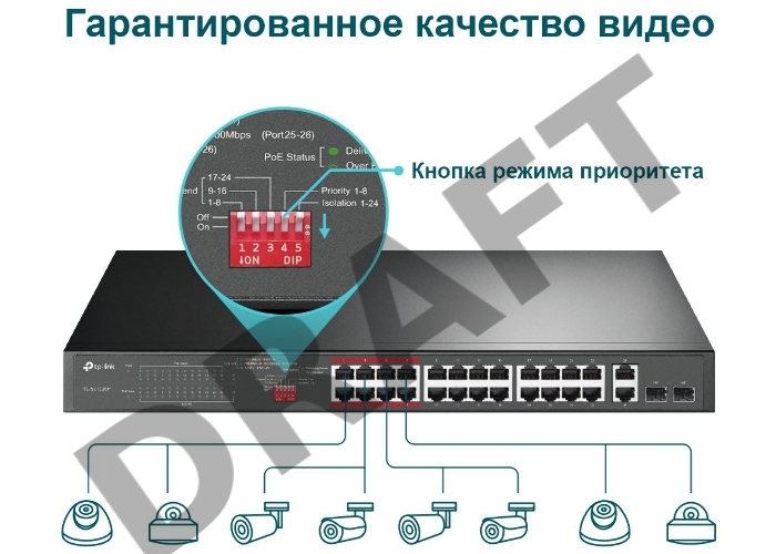 Коммутатор 24-port 10/100Mbps Unmanaged PoE+ Switch with 2 combo RJ-45/SFP uplink ports, metal case, rack mount, 24 802.3af/at compliant PoE+ ports, 2 gigabit combo RJ-45/SFP uplink ports, DIP switches for Extend mode, Isolation mode and Priority mode, up
