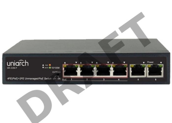 Коммутатор доступа Uniarch SW-2106-P 4х100Mbps PoE(RJ45)+2х100Mbps (RJ45), PoE бюджет макс. до 65 Вт.