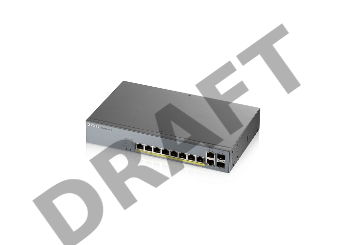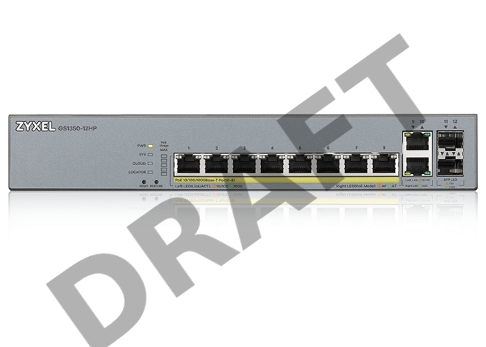 Коммутатор Zyxel GS1350-12HP, 10xGE (8xPoE+), 2xSFP, бюджет PoE 130 Вт, дальность передачи питания до 250 м, автоперезагрузка PoE-портов, повышенная защита от перенапряжений и электростатических разрядов