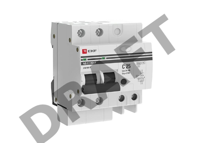 Выключатель авт. диф. тока 2п 4мод. C 25А 30мА тип AC 4.5кА АД-2 PROxima EKF DA2-25-30-pro