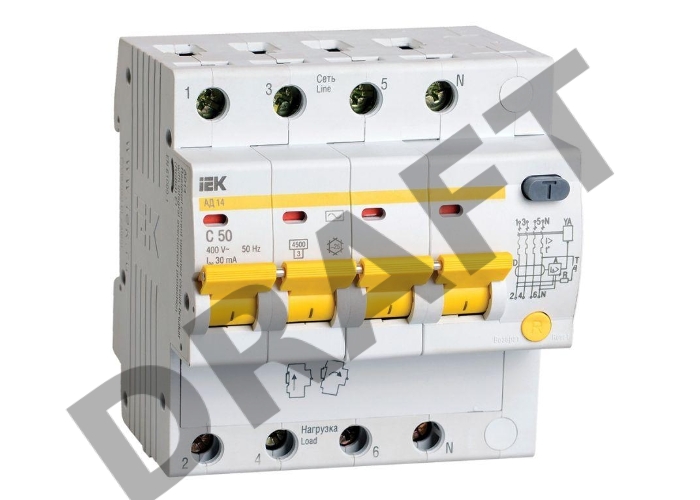 Выключатель автоматический дифференциального тока 4п C 50А 30мА тип AC 4.5кА АД-14 ИЭК MAD10-4-050-C-030