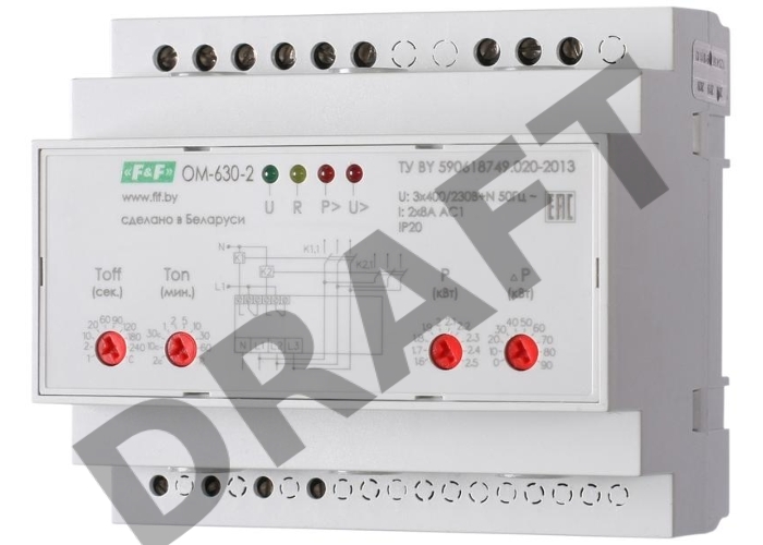 Ограничитель мощности ОМ-630-2 работа с приоритетной и неприоритетной нагрузками встроен. счетчик числа отключений монтаж на DIN-рейке 35мм 3х400/230+N 2х8А 2х1Р F&F EA03.001.009