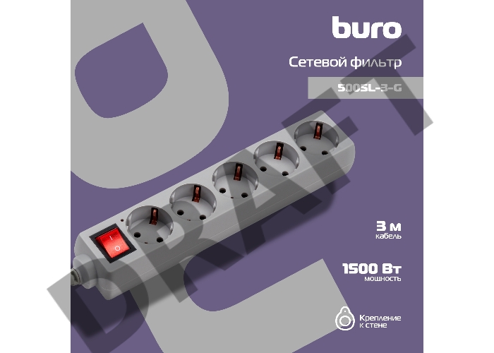 Сетевой фильтр Buro 500SL-3-G 3м (5 розеток) серый (пакет ПЭ)