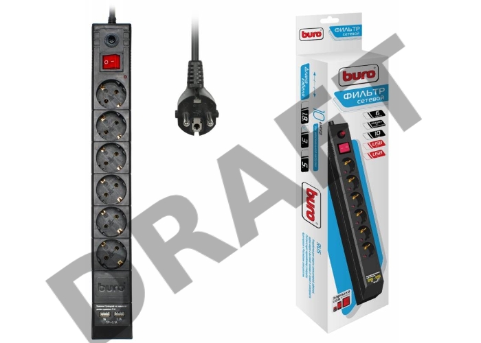 Сетевой фильтр Buro BU-SP3_USB_2A-B 3м (6 розеток) черный (коробка)