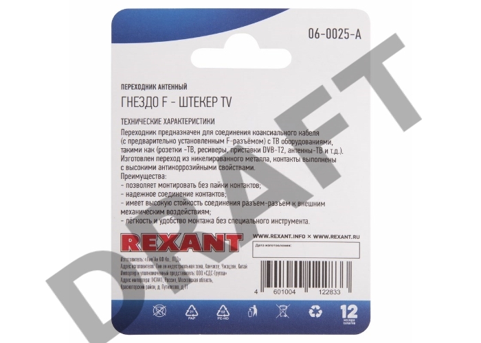 Переходник антенный, (гнездо F - штекер TV), (1шт.) REXANT