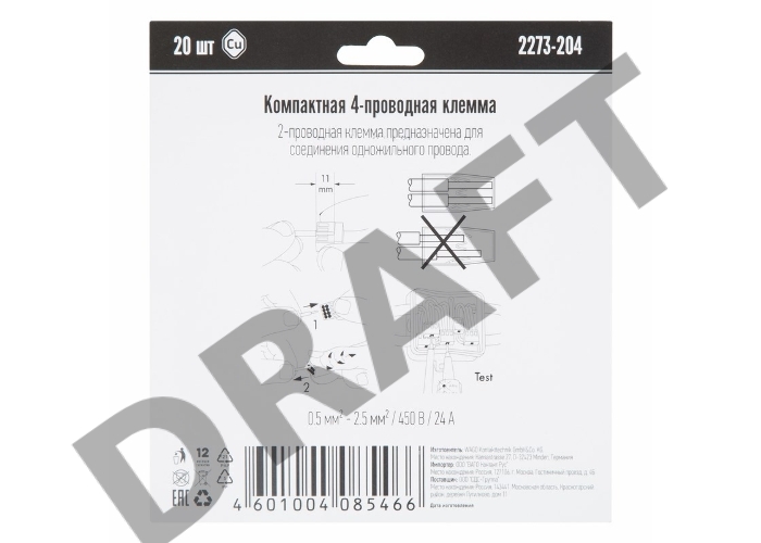 Компактная клемма 4-х проводная, 20 штук (серия 2273-204)