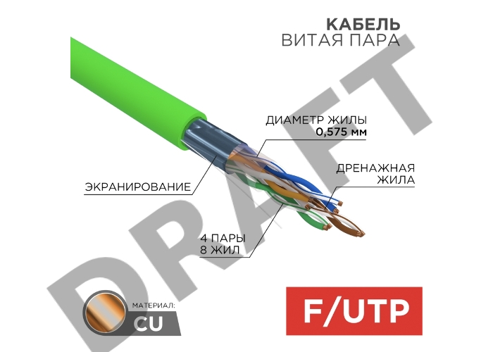 Кабель витая пара F/UTP, CAT 6, нг(А)-LSLTx, 4х2х0,575мм, 23AWG, INDOOR, SOLID, зеленый, 305м REXANT