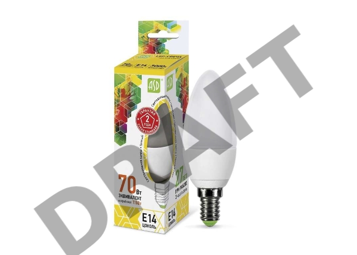 Лампа светодиодная ASD LED-СВЕЧА-standard 7.5Вт 160-260В Е14 3000К 600Лм