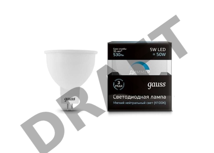 Лампа светодиодная диммируемая MR16 5Вт 4100К белый GU5.3 530лм 180-265В GAUSS 101505205-D