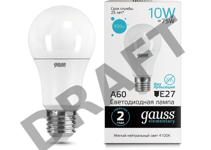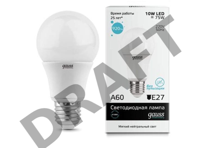 Лампа светодиодная GAUSS Elementary 23220 LED A60 E27 10W 4100K 1/40