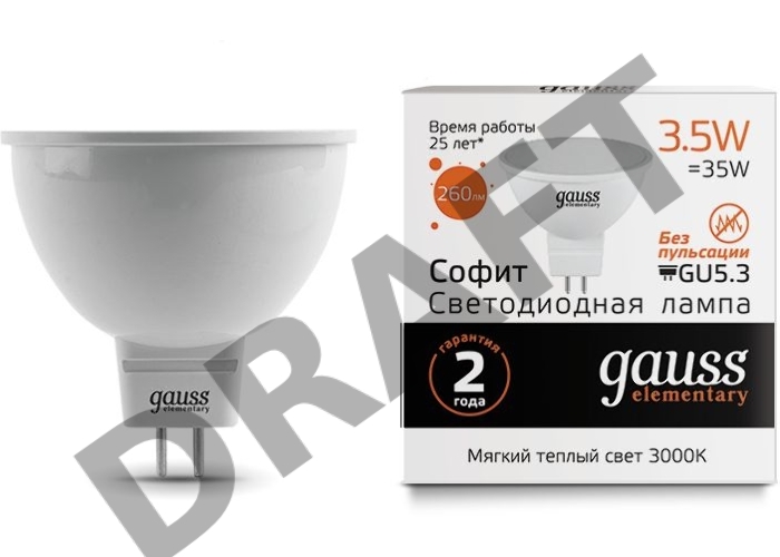 Лампа светодиодная Gauss Elementary MR16 3.5Вт цок.:GU5.3 спот 220B 3000K св.свеч.бел.теп. (упак.:10шт) (13514)