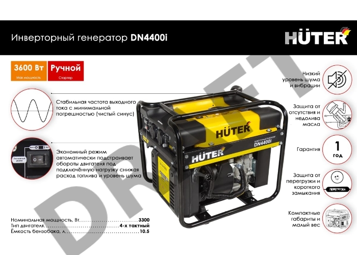 Инверторный бензиновый генератор HUTER DN4400i 220В 3.8кВт