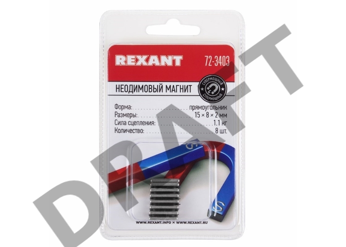 Неодимовый магнит прямоугольник 15х8х2мм сцепление 1,1 кг (упаковка 8 шт) Rexant