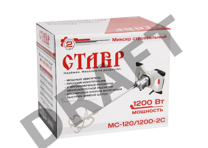 Ставр МС-120/1200-2С Миксер строительный 1200 Вт, 2 скорости 120-500/170-700об/мин, диаметр лопасти 120 мм, длина лопасти 590мм, максимальный крутящий момент 8,82 Нм, регулировка числа оборотов, лопасть в комплекте