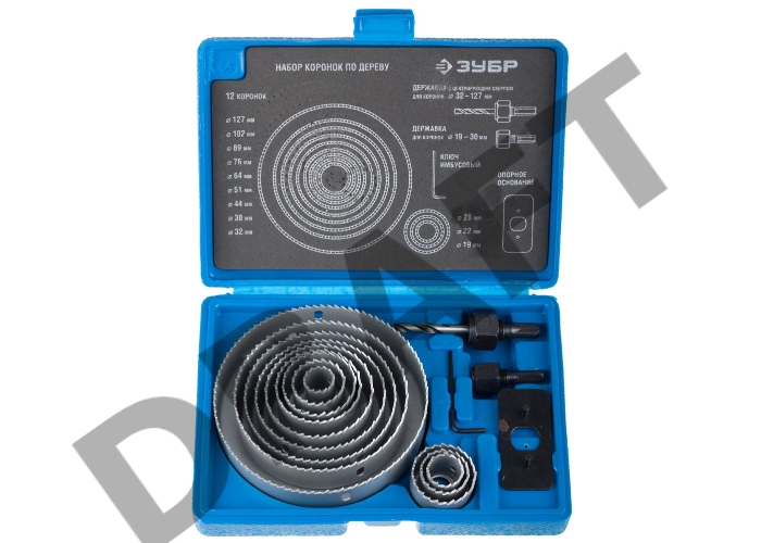 Набор ЗУБР "ЭКСПЕРТ" 29554-H15_z01 Коронки по дереву 19-127мм, державка 19-30мм, державка с опорн. основан, ключ имбус. 2,5мм, 15 пред