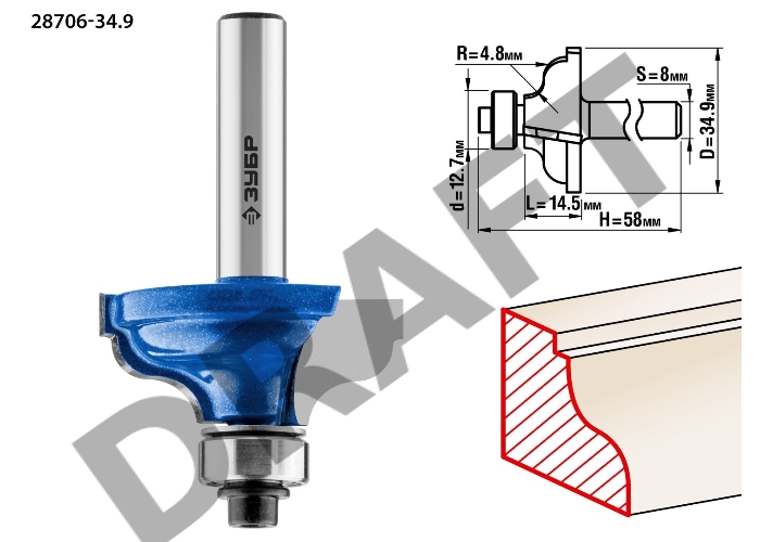 Фреза ЗУБР 28706-34.9 кромочная калевочная №5 d= 34.9мм дл.-14.5мм рад.-4.8мм хв.-8мм d-12.7мм