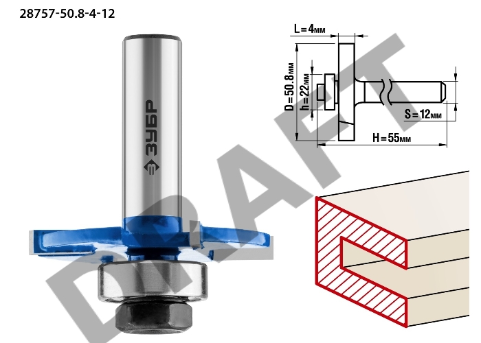 Фреза ЗУБР 28757-50.8-4-12 горизонтально-пазовая d= 50.8мм высота-4мм хв.-12мм d-22мм профессионал