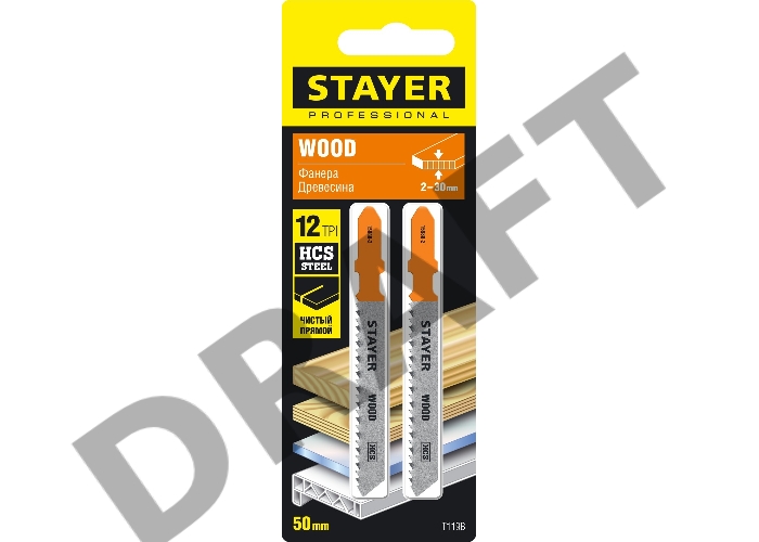 Полотна STAYER, T119B, для эл/лобзика, HCS, по дереву, фанере, ДСП, T-хвост., шаг 2мм, 50мм, 2шт