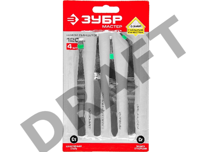 Набор ЗУБР 22215-H4: Пинцеты, нержавеющая сталь, прямой, заостренные губки, изогнутый, самозажимной прямой, плоские и широкие губки, 120мм