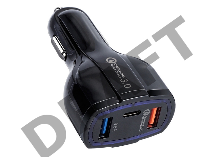 Зарядное устройство автомобильное ORIENT CAR QC-12V3B Quick Charge 3.0, 2xUSB-A + 1xUSB Type-C: QC выход - 5В,3.0A/ 9В,1.67А/ 12В,1.25А; 2,3