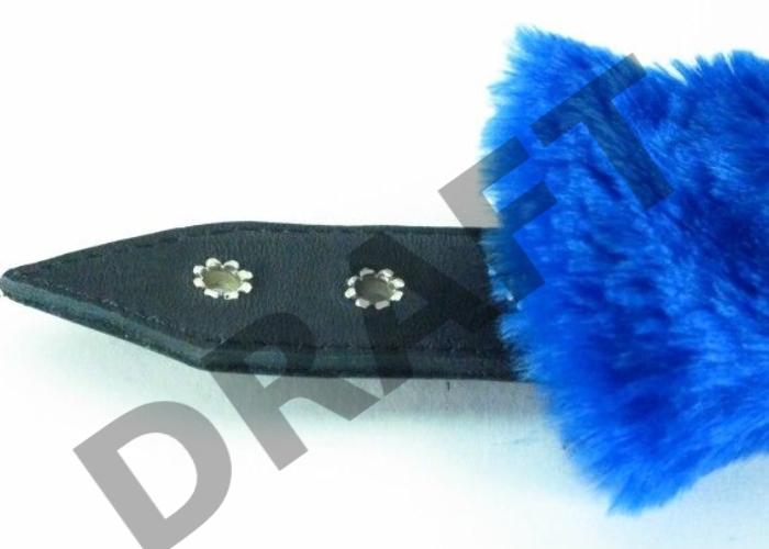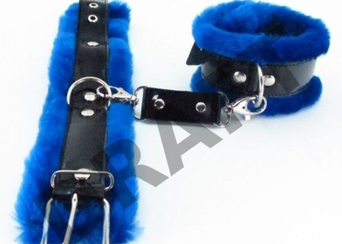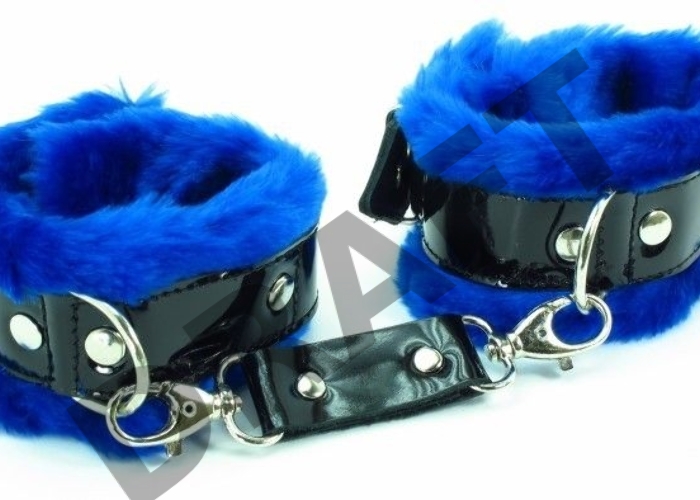 Синие меховые наручники с ремешками из лакированной кожи
