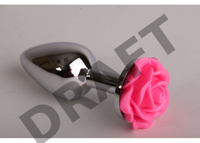Серебристая анальная пробка с розовой розочкой - 7,6 см.